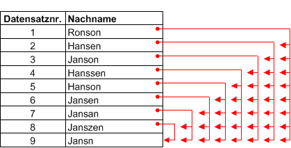 Da Fuzzy-Duplikate im Testfeld nacheinander ermittelt werden, werden den Gruppeneigentümern nur diejenigen Fuzzy-Duplikate zugeordnet, die im Feld nach diesen angezeigt werden, keine vorhergehenden. In vielen Fällen ist ein Gruppeneigentümer selbst ein Element einer oder mehrer vorangegangener Gruppen. Das Gegenteil ist jedoch nicht möglich. Eigentümer vorangegangener Gruppen können nicht Elemente folgender Gruppen sein. Sobald ein Wert die Position eines Gruppeneigentümer einnimmt, wird er in folgenden Gruppen nicht mehr berücksichtigt. Im obigen Beispiel ist der Eigentümer der Gruppe 6, „Jansen“, Element von zwei vorangegangenen Gruppen. Die Eigentümer dieser Gruppen („Hansen“ und „Janson“) sind jedoch keine Elemente der Gruppe 6, obwohl es sich bei ihnen um Fuzzy-Duplikate von „Jansen“ handelt. |