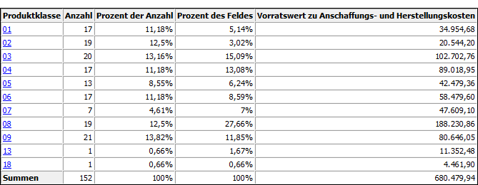 - Klassifizierung nach Produktklasse in einer Bestandstabelle