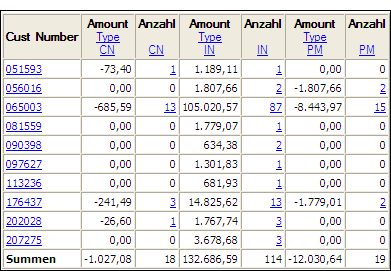 - Kreuztabelle von Kundennummer und Transaktionstyp in einer Forderungstabelle