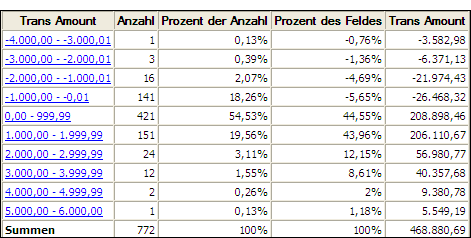 Sie könnten beispielsweise die Schichtung einer Forderungstabelle auf Basis des Felds „Rechnungsbetrag“ ermitteln, um die Datensätze in Intervalle von $5000 zu gruppieren – Rechnungen von $0 bis $4.999,99, von $5.000 bis $9.999,99 usw. Gleichzeitig finden Sie die Gesamtanzahl der Transaktionen und den gesamten Transaktionsbetrag pro Intervall heraus.