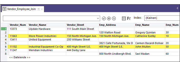 Die zusammengeführte Ausgabetabelle beinhaltet Lieferanten und Mitarbeiter mit derselben Adresse.