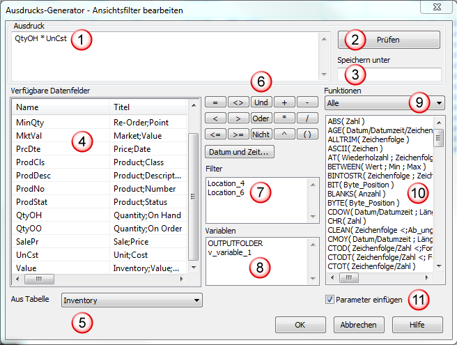 Listet die Variablen auf, die mit der ausgewählten Tabelle verknüpft sind Doppelklicken Sie auf einen Variablen-Eintrag, um diesen zum Textfeld Ausdruck hinzuzufügen. |
