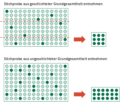 Die benötigte Stichprobenanzahl wird dann pro Schicht berechnet und summiert, anstatt die gesamte, nicht in Schichten aufgeteilte Grundgesamtheit als Basis heranzuziehen. Für eine identische Datenmenge ergibt der geschichtete Ansatz in der Regel einen wesentlich geringeren Stichprobenumfang als die ungeschichtete Vorgehensweise.