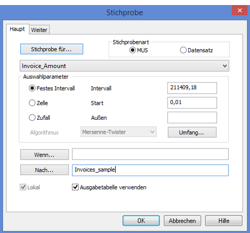 Um die Stichprobe zu ziehen, verwenden wir die Auswahlmethode „festes Intervall“. Bei der Auswahlmethode „Festes Intervall“ geben Sie an, welche Währungseinheit zuerst ausgewählt wird. Jede folgende Auswahl erfolgt hiervon ausgehend in einem festen Intervall bzw. einem bestimmten Abstand. Detaillierte Informationen finden Sie unter Auswahlmethode festes Intervall. |