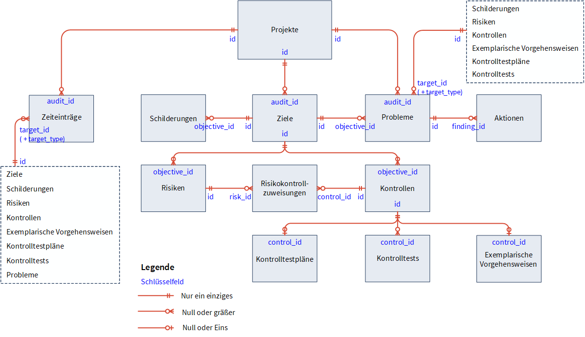 Das folgende Diagramm zeigt die Beziehung der unterschiedlichen Tabellen in der Projekte-App und enthält Angaben über häufige Schlüsselfelder, die Sie zur Zusammenführung von Tabellen nach ihrem Import verwenden können.