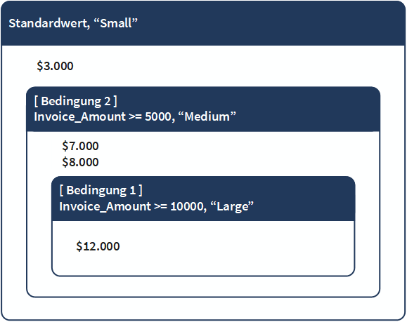 - Zugewiesener Wert = MediumWenn Sie die Reihenfolge der Bedingungen umkehren, wird dem Betrag der Wert „Medium“ zugewiesen. Auch das ist korrekt, weil der Betrag größer als $5.000 ist. Die Wertzuweisung erfolgt dann jedoch nicht mehr wie beabsichtigt, weil Invoice_Amount >= 5000 eine weniger restriktive Bedingung ist und dadurch bereits Beträge erfasst, die von ihr noch nicht erfasst werden sollen.