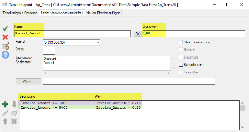 Sie erstellen ein Kalkulationsfeld Discount amount (Rabatthöhe), das die Größe des Rechnungsbetrags in jedem Datensatz erkennt und die Rabatthöhe unter Verwendung des korrekten Prozentsatzes berechnet: