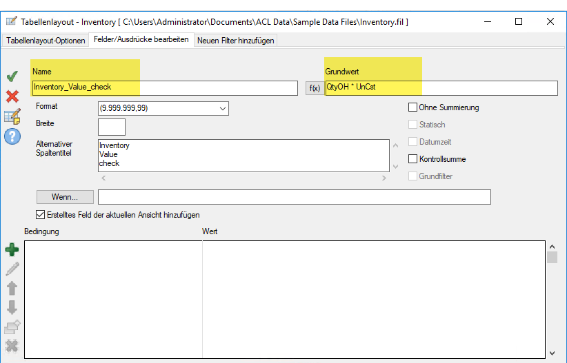 In der Tabellenansicht können Sie das Kalkulationsfeld (Inventory Value check) neben dem physischen Quelldatenfeld (Inventory Value at Cost) (VorratswertzuAHK) positionieren und die Werte vergleichen.