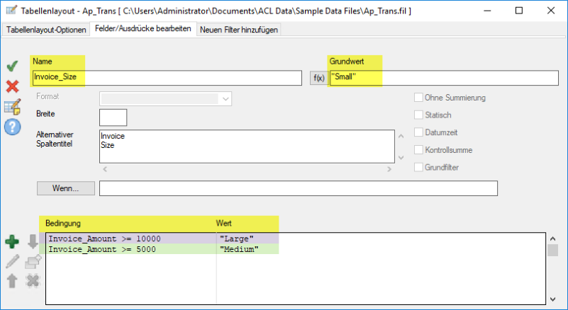 Sie erstellen ein Kalkulationsfeld Invoice size (Rechnungsgröße), das die Größe des Rechnungsbetrags in jedem Datensatz erkennt und den korrekten Literalwert zuweist: