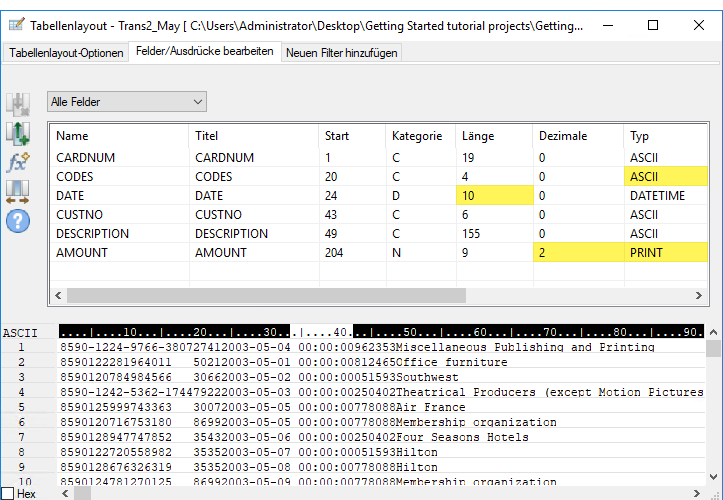 IMPORT EXCEL TO Trans1_Mai_s "C:\Benutzer\Benutzerkontoname\Dokumente\ACL Data\Beispiel-Datendateien\Trans1_Mai_s.fil" FROM "Trans_Mai.xls" TABLE "Trans1_Mai$" KEEPTITLEFIELD "CARDNUM" C WID 19 AS "" FIELD "CODES" N WID 4 DEC 0 AS "" FIELD "DATE" D WID 19 PIC "JJJJ-MM-TT hh:mm:ss" AS "" FIELD "CUSTNO" C WID 6 AS "" FIELD "DESCRIPTION" C WID 95 AS "" FIELD "AMOUNT" C WID 9 AS ""