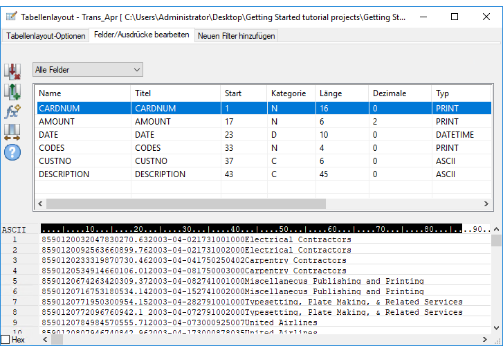 IMPORT EXCEL TO Trans_Apr_s "C:\Benutzer\Benutzerkontoname\Dokumente\ACL Data\Beispiel-Datendateien\Trans_Apr_s.fil" FROM "Trans_April.xls" TABLE "Trans_Apr$" KEEPTITLE FIELD "CARDNUM" N WID 16 DEC 0 AS "" FIELD "AMOUNT" N WID 6 DEC 2 AS "" FIELD "DATE" D WID 10 PIC "JJJJ-MM-TT" AS "" FIELD "CODES" N WID 4 DEC 0 AS "" FIELD "CUSTNO" C WID 6 AS "" FIELD "DESCRIPTION" C WID 45 AS ""