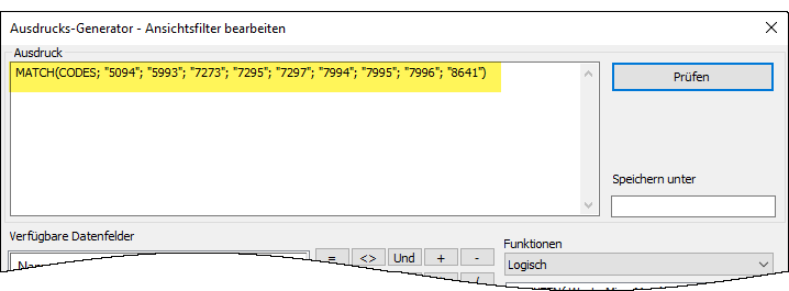 DEFINE FIELD f_verbotene_Codes COMPUTED MATCH(CODES; "5094"; "5993"; "7273"; "7295"; "7297"; "7994"; "7995"; "7996"; "8641")
