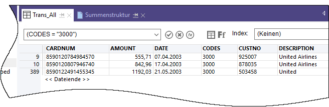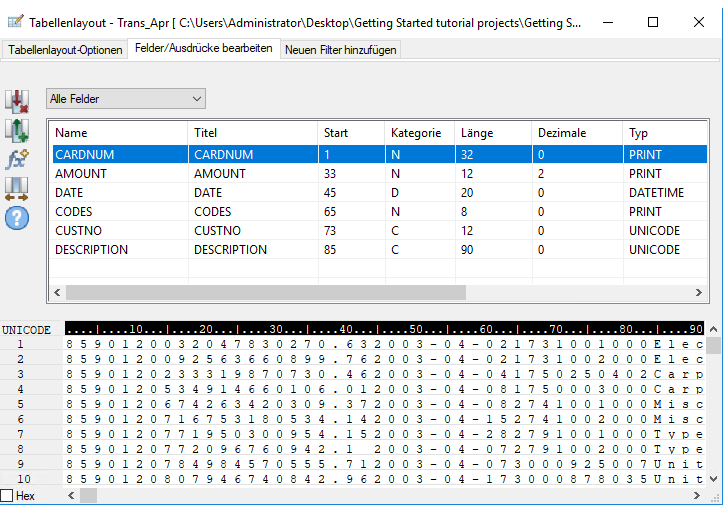 IMPORT EXCEL TO Trans_Apr_s "C:\Benutzer\Benutzerkontoname\Dokumente\ACL Data\Beispiel-Datendateien\Trans_Apr_s.fil" FROM "Trans_April.XLS" TABLE "Trans_Apr$" KEEPTITLE FIELD "CARDNUM" N WID 16 DEC 0 AS "" FIELD "AMOUNT" N WID 6 DEC 2 AS "" FIELD "DATE" D WID 10 PIC "JJJJ-MM-TT" AS "" FIELD "CODES" N WID 4 DEC 0 AS "" FIELD "CUSTNO" C WID 6 AS "" FIELD "DESCRIPTION" C WID 45 AS ""