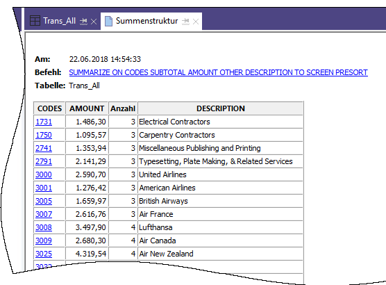 SUMMARIZE ON CODES SUBTOTAL AMOUNT OTHER DESCRIPTION TO "Alle_Transaktionen_gruppiert_s.FIL" OPEN PRESORT STATISTICS