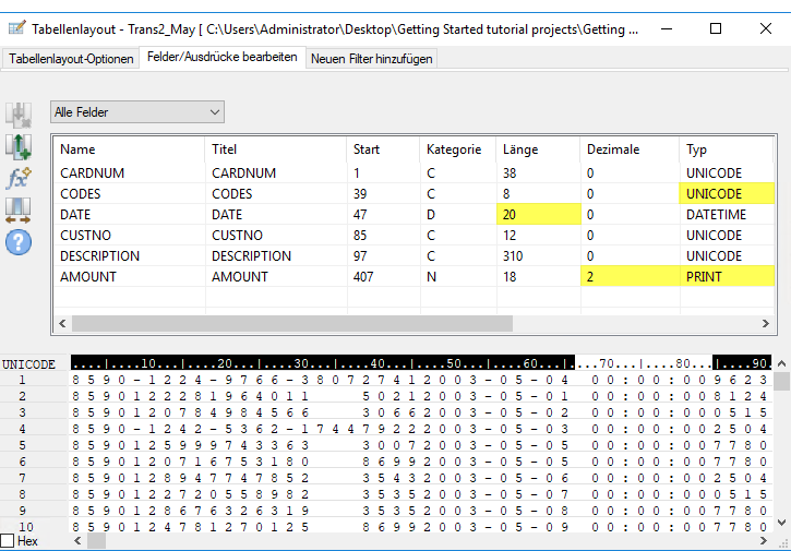 IMPORT EXCEL TO Trans1_Mai_s "C:\Benutzer\Benutzerkontoname\Dokumente\ACL Data\Beispiel-Datendateien\Trans1_Mai_s.fil" FROM "Trans_Mai.xls" TABLE "Trans1_Mai$" KEEPTITLEFIELD "CARDNUM" C WID 19 AS "" FIELD "CODES" N WID 4 DEC 0 AS "" FIELD "DATE" D WID 19 PIC "JJJJ-MM-TT hh:mm:ss" AS "" FIELD "CUSTNO" C WID 6 AS "" FIELD "DESCRIPTION" C WID 95 AS "" FIELD "AMOUNT" C WID 9 AS ""