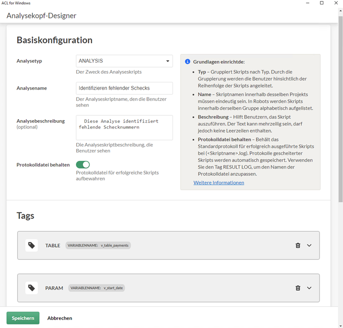 Wenn Sie im Designer auf Speichern klicken, werden Ihre konfigurierten Tags automatisch in einen Analysekopf am Anfang des Skripts umgewandelt. Falls Sie möchten, können Sie den Analysekopf manuell bearbeiten. Es wird jedoch empfohlen, für solche Änderungen den Designer erneut zu öffnen.
