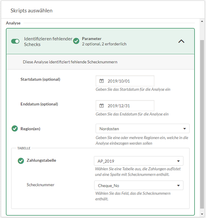 Erzeugt einen Ausgabeparameter, der angibt, dass die Ergebnistabelle „Missing_Checks“ (Fehlende_Schecks) für Benutzer in Robots zur Verfügung gestellt wird. Ausgabe-Ergebnisse aus Skripts werden nicht automatisch zur Verfügung gestellt, auch wenn sie vorhanden sind. Die Verfügbarkeit muss im Analysekopf festgelegt werden. |
