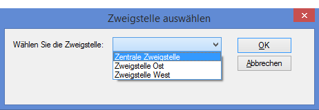 DIALOG (DIALOG TITLE "Zweig auswählen" WIDTH 464 HEIGHT 116 ) (BUTTONSET TITLE "&OK;&Abbrechen" AT 336 12 DEFAULT 1 ) (TEXT TITLE "Den Zweig auswählen:" AT 12 16 ) (DROPDOWN TITLE "Zentraler Zweig;Östlicher Zweig;Westlicher Zweig" TO "DROPDOWN1" AT 156 12 )