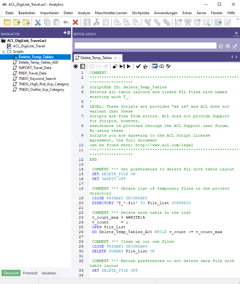 Skripts werden einzeln in der Registerkarte Übersicht im Navigator dargestellt. Trotz der einzelnen Darstellung von Skripts befinden sich alle Skripts eines Analytics-Projekts in einer einzelnen Analytics-Projektdatei (*.acl).