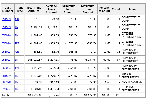 The example below shows the results of summarizing an accounts receivable table on customer number and transaction type. The transaction amount is subtotaled, with some associated statistics. The results are output to screen.