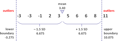 In the first example, you use the mean ± 1 standard deviation to establish the upper and lower outlier boundaries. Four values are identified as outliers.
