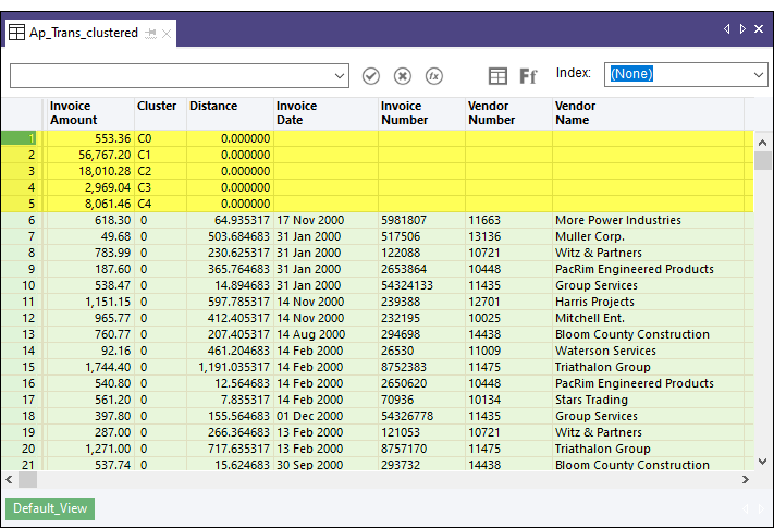 In the output results shown below, the first five records are system-generated and equate to the desired number of clusters that you specified. In the Invoice Amount field, the five records show the centroid, or center point, that the clustering algorithm calculates for each of the five clusters of invoice amounts. For example, the centroid for cluster 3 ( C3 ) is 2,969.04. For more information, see How the clustering algorithm works.