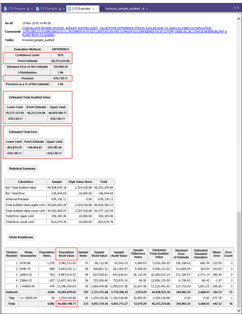 Confidence Level (%) Number of Expected Errors Book Value Precision Limits Strata Boundaries Population (Count, Value) Top certainty stratum cutoff (Cutoff, Count, Value) |