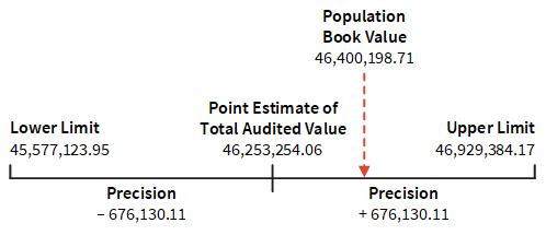 Point Estimate (46,253,254.06) a statistical projection of the most likely audited value of the entire Invoices table Precision (676,130.11) a statistical projection of the amount by which the Point Estimate could vary