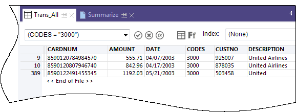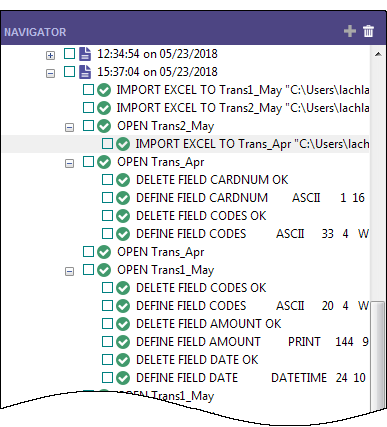 IMPORT EXCEL TO Trans1_May_s "C:\Users\user_account_name\Documents\ACL Data\Sample Data Files\Trans1_May_s.fil" FROM "Trans_May.xls" TABLE "Trans1_May$" KEEPTITLE FIELD "CARDNUM" C WID 19 AS "" FIELD "CODES" N WID 4 DEC 0 AS "" FIELD "DATE" D WID 19 PIC "YYYY-MM-DD hh:mm:ss" AS "" FIELD "CUSTNO" C WID 6 AS "" FIELD "DESCRIPTION" C WID 95 AS "" FIELD "AMOUNT" C WID 9 AS ""