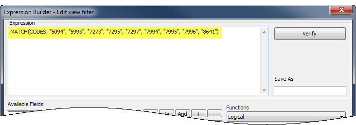 DEFINE FIELD f_Prohibited_codes COMPUTED MATCH(CODES, "5094", "5993", "7273", "7295", "7297", "7994", "7995", "7996", "8641")