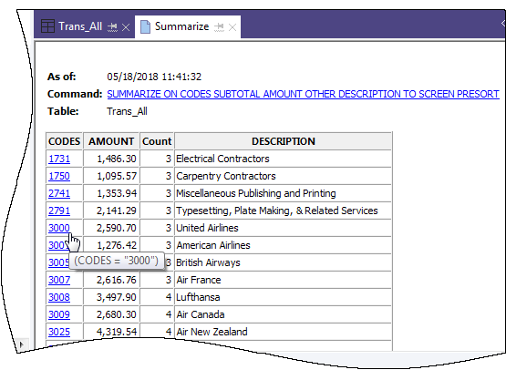 SUMMARIZE ON CODES SUBTOTAL AMOUNT OTHER DESCRIPTION TO "Trans_All_Grouped_s.FIL" OPEN PRESORT STATISTICS