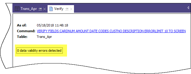 IF WRITE1=0 DIALOG (DIALOG TITLE "User Dialog" WIDTH 490 HEIGHT 100 ) (BUTTONSET TITLE "&OK;&Cancel" AT 360 12 DEFAULT 1 ) (TEXT TITLE "Trans1_May_s table: 0 data validity errors detected" AT 12 28 )