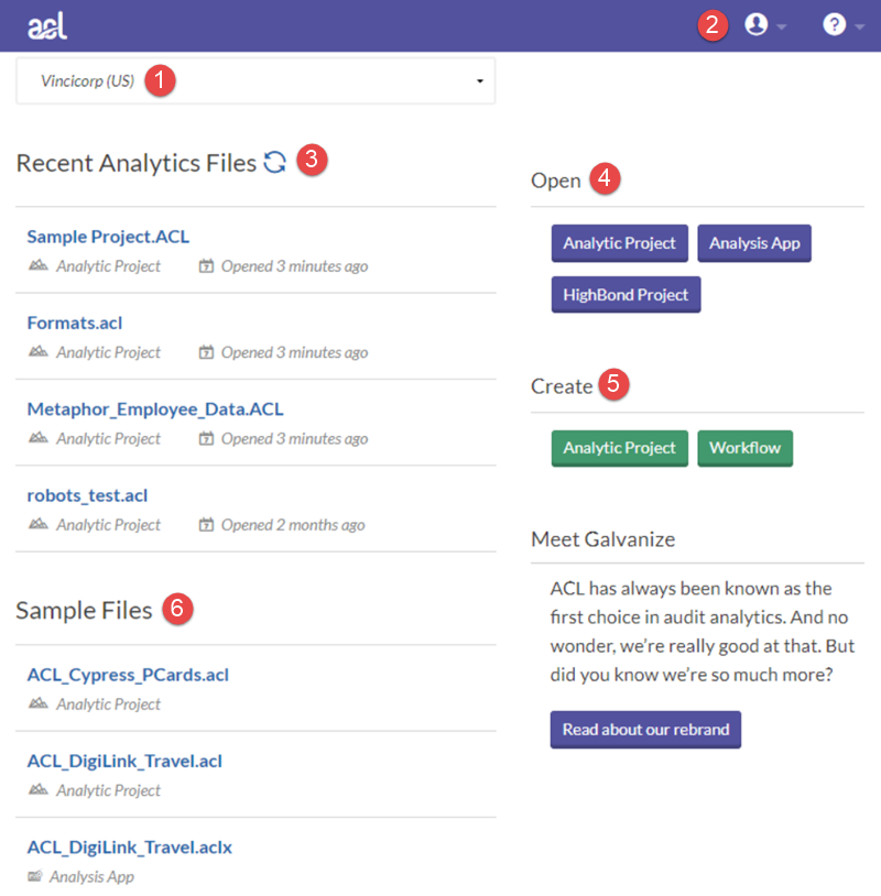 | 6 | Sample Files | Open pre-built Analytics projects that include a variety of sample data. |
