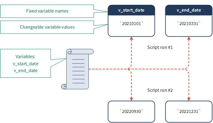 In the example below, a variable with the name v_start_date currently contains the date value `20210101`, and a variable with the name v_end_date currently contains the date value `20210331`.