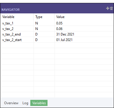 You can create one of these variables by copying the ASSIGN command and its parameters to the Analytics command line and pressing Enter. In the Navigator, open the Variables tab to see the result.