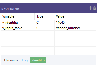 The Variables tab, in the Navigator, tracks the creation of variables and the assignment of values to variables in real time. The read-only tab displays the names, data types, and current values of all variables in an Analytics project. Names are listed alphabetically.