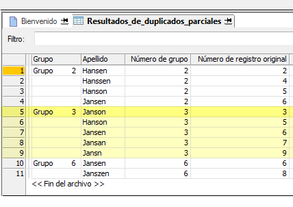 Los resultados de la salida se distribuyen en grupos que se identifican como 2, 3 y 6. El Número de registro original del primer duplicado inexacto de cada grupo se utiliza para identificar al grupo. Por ejemplo, “Janson” es el nombre del número de registro 3 en la tabla original y, como “Janson” es el primer valor del grupo, basándose en la secuencia de registros de la tabla original, el grupo se identifica como Grupo 3. Para obtener más información, vea Cómo se agrupan los duplicados inexactos.