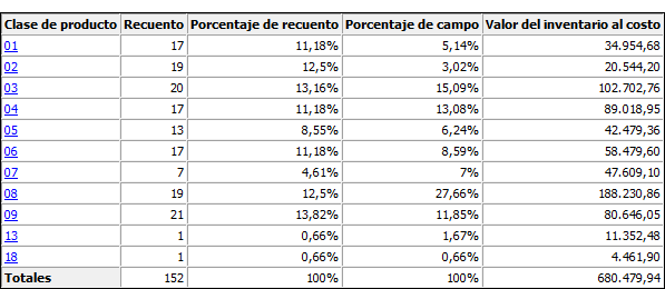 Los resultados demuestran que el valor del inventario está concentrado en cuatro clases de productos: 03, 04, 08, 09.
