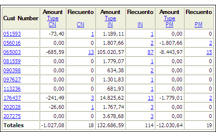 - generación de tablas cruzadas del número de cliente y el tipo de transacción en una tabla de cuentas por cobrar