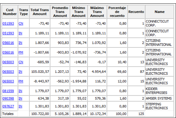 El ejemplo a continuación muestra los resultados del resumen de una tabla de cuentas por cobrar en base al número de cliente y al tipo de transacción. Se calculó el subtotal del importe de la transacción, con algunas estadísticas asociadas. Los resultados son la salida en pantalla.