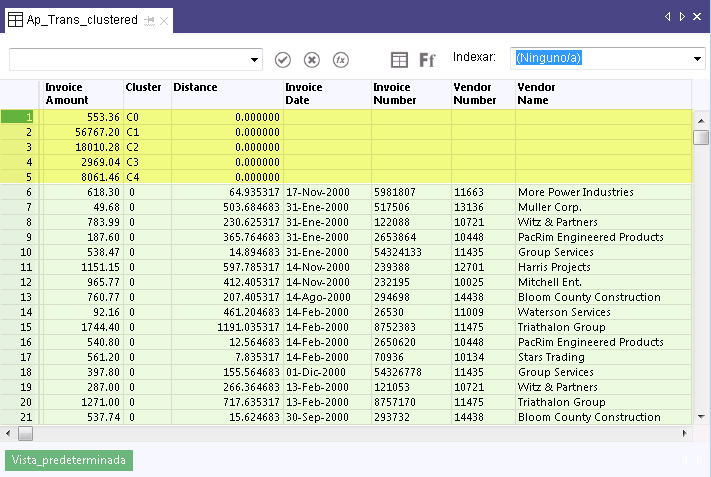En los resultados de la salida que se muestran a continuación, los primeros cinco registros son generados por el sistema y coinciden con el número deseado de clústeres que usted especificó. En el campo Invoice Amount, los cinco registros muestran el centroide, o punto central, que el algoritmo de agrupación en clústeres calcula para cada uno de los cinco clústeres con los importes de las facturas. Por ejemplo, el centroide del clúster 3 ( C3 ) es 2.969,04. Para obtener más información, consulte Cómo funciona el algoritmo de agrupación en clústeres.