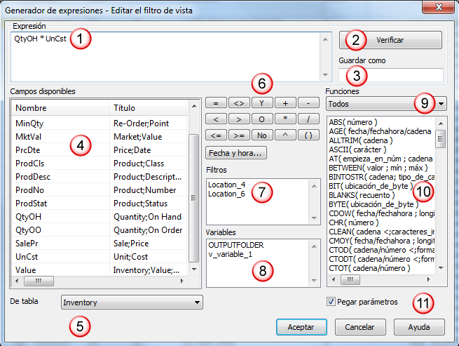 | 6 | Botones Operador y Selector de fecha y hora | Botones para agregar operadores o fechas, fechahoras u horas al cuadro de texto Expresión |