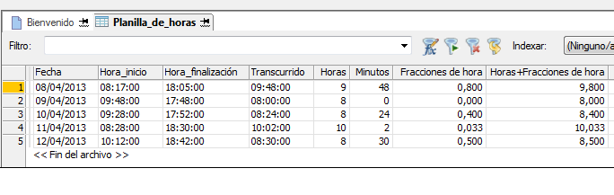 El Formato de hora (Herramientas > Opciones > Fecha y hora) del primer ejemplo es hh:mm:ss y, en el segundo ejemplo, es hh:mm:ss PM. Ambos ejemplos implican una serie de cálculos de fechahora, que se explican en las siguientes secciones.
