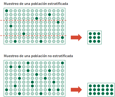 Por eso, la cantidad de muestras necesarias se calcula estrato por estrato y se totaliza en lugar de calcularse para toda la población sin estratificar. Para el mismo conjunto de datos, el enfoque estratificado suele requerir un tamaño de muestra más pequeño que el enfoque no estratificado.