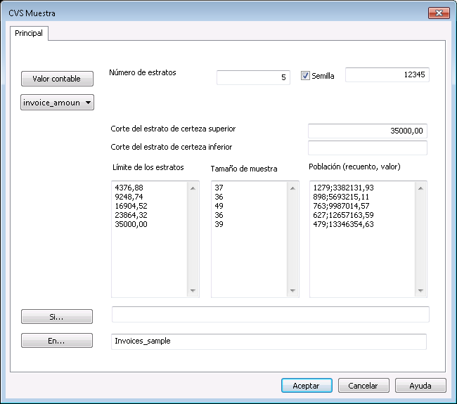 Los valores contables se asignan al estrato de certeza inferior si son inferiores o iguales al valor de corte. Los valores contables se asignan al estrato de certeza superior si son superiores o iguales al valor de corte. |