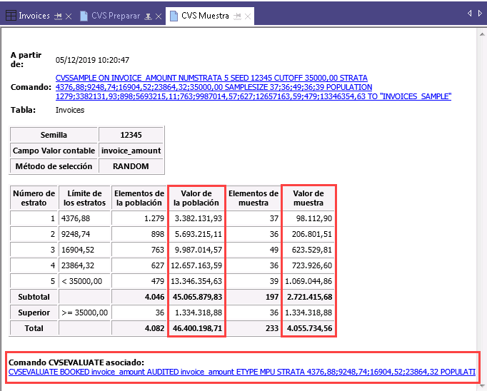 - En la parte inferior del área de visualización de CVS Muestra, haga clic en el enlace CVSEVALUATE para cargar el comando en la línea de comandos.