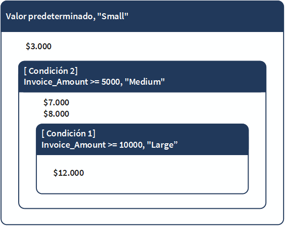 - Valor asignado = MediumSi se invierte el orden de las condiciones, al importe se le asigna el valor "Medium", lo cual es correcto porque el importe es superior a $5,000. Sin embargo, la asignación de valores no está funcionando de la manera deseada porque Invoice_Amount >= 5000 es una condición menos restrictiva y está captando importes que usted no desea captar.