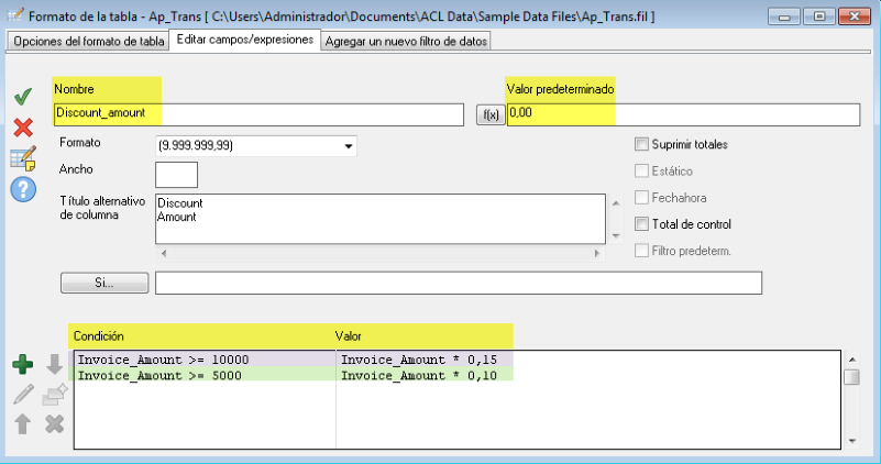 El siguiente ejemplo muestra la definición del campo calculado Discount amount en el cuadro de diálogo Formato de tabla. El valor literal 0.00 aparece en el campo Valor predeterminado. Los valores calculados Invoice_Amount * 0.10 y Invoice_Amount * 0.15 aparecen en una condición independiente.