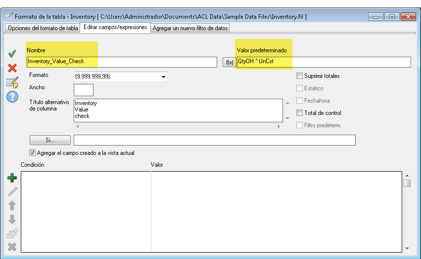 En la vista de la tabla, puede colocar el campo calculado (Inventory Value check) junto al campo de datos de origen físico (Inventory Value at Cost) y comparar los valores.