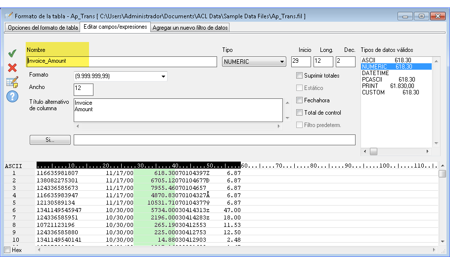 El siguiente ejemplo muestra la definición del campo Invoice_Amount en el cuadro de diálogo Formato de tabla. En el área de previsualización de datos, se destacan en verde los datos físicos reales que se incluyen en el campo.